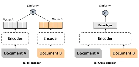 기존 벡터 검색을 위해 사용하는 구조가 Bi-encoder ↔ rerank를 위한 구조는 Cross-encoder