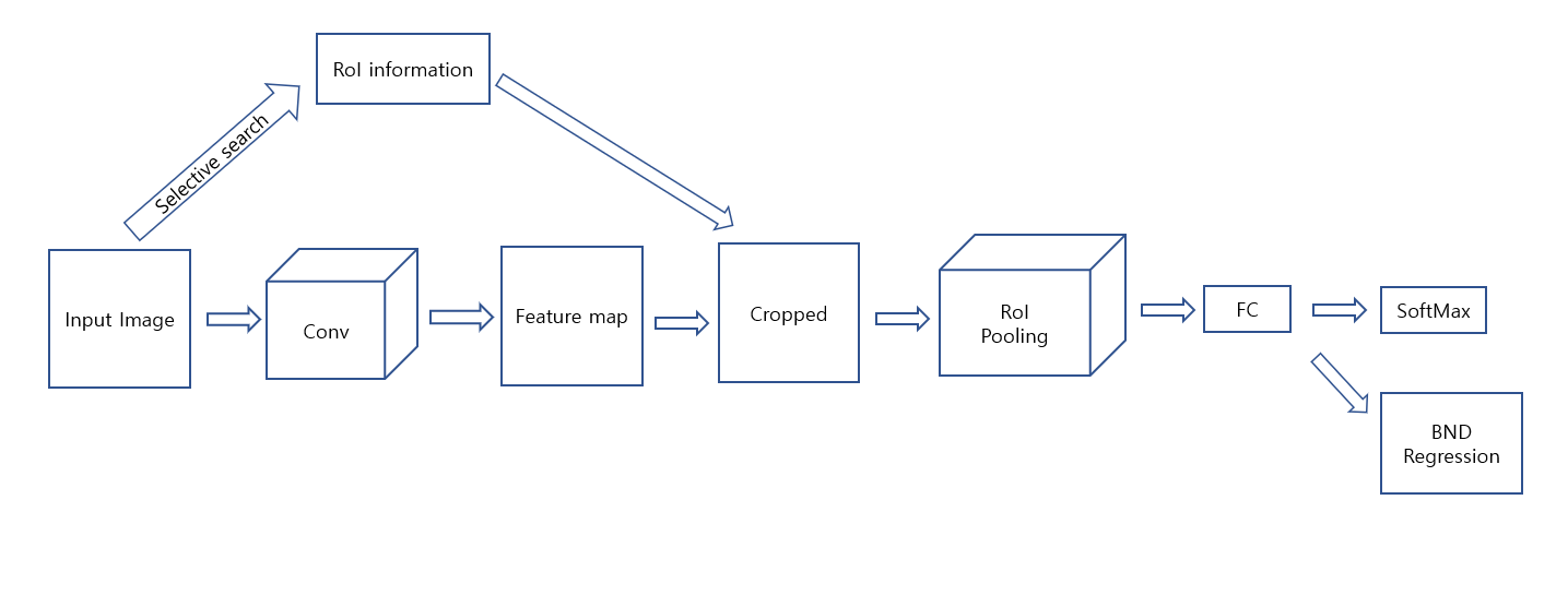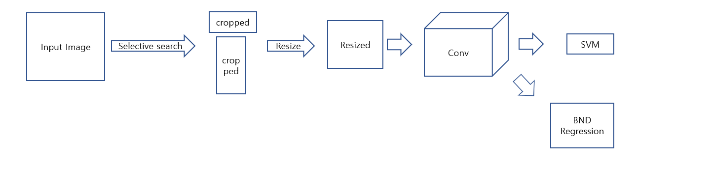 R-CNN의 경우 region propose를 진행 하여 2,000개의 cropped image를 뽑아내고 이를 독립적으로 Conv를 통과시킵니다. 즉, region proposal과 Conv과 완전하게 분리되어 있는 것입니다. 이는 직관적으로 이해 할 수 있는데 R-CNN에서늬 Conv는 Input으로 cropped image를 받는다는 것을 알고 나면 확실하게 regin proposal이 끝난 뒤 Conv를 진행 하는 즉, 두가지의 process가 완전히 독립적이라는 것을 알 수 있습니다.