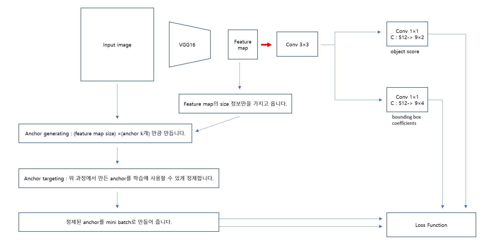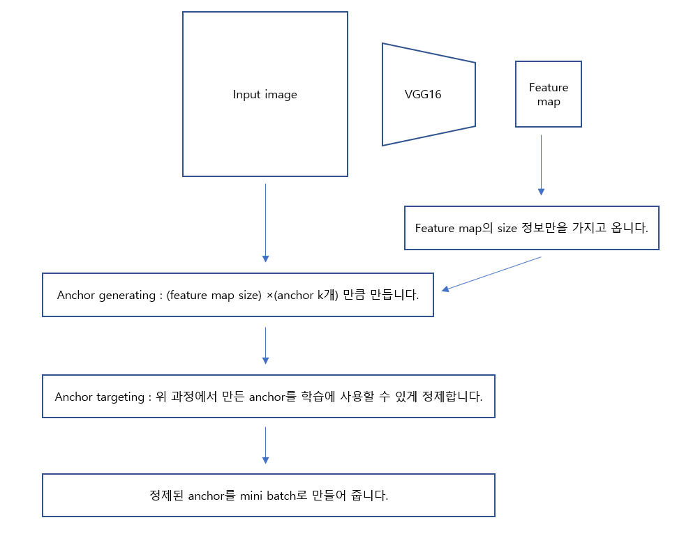 여기서 정확히 anchor란 22500×4의 vector입니다. 22500은 하나의 input image에 대한 anchor이며 각각에는 좌표에 관한 정보가 4개씩 들어가 있습니다. 즉 여기서도 주의해야 할 점이 anchor는 image 혹은 feature map이 아닙니다. 단순히 좌표일 뿐입니다.