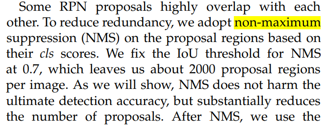 이렇게 학습된 RPN은 Input image를 넣었을 때 bounding box coefficient와 objectness score를 반환해 줍니다. 즉, . 여기서 non-maximum suppression (NMS) 을 추가로 적용해 주어 RoI를 줄일 수 있습니다. NMS는 확실하게 RoI의 개수를 줄여주지만 성능에는 별 차이가 없었다고 합니다.