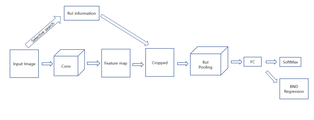 1. Input image를 selective algorithm을 이용하여 RoI를 추출합니다.