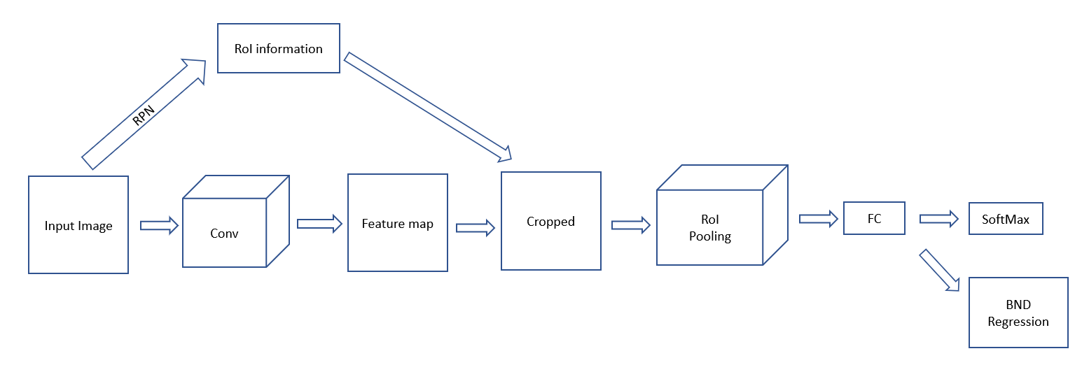 trained RPN은 RoI를 output으로 줍니다. 이를 이용하여 feature map size에 맞게 mapping하여 feature map을 crop 합니다. RoI Pooling을 거쳐 fixed vector로 만들고 softmax classification과 bnd regression을 진행합니다.