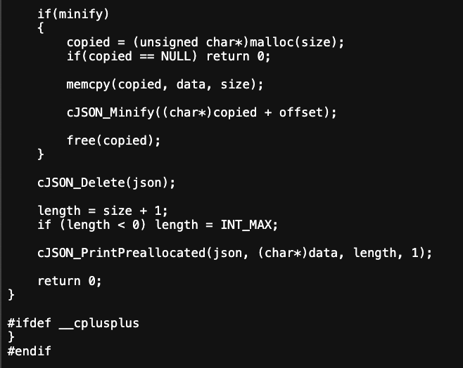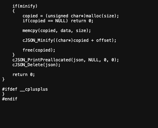 length = strlen(printed_json); cJSON_PrintPreallocated(json, printed_json, length, 0);으로 작성했다. 후자는 print_json의 길이만큼 실제로 버퍼를 할당하여 JSON 데이터를 포맷팅된 상태로 출력한다. 반면 전자는 'NULL'과 '0'을 사용하므로 포맷팅이나 실제로 출력이 수행되지 않는다. 이는 단순히 메모리 관련 작업을 피하고 JSON 객체를 정리하는 목적이다.(문자열을 버려버림)