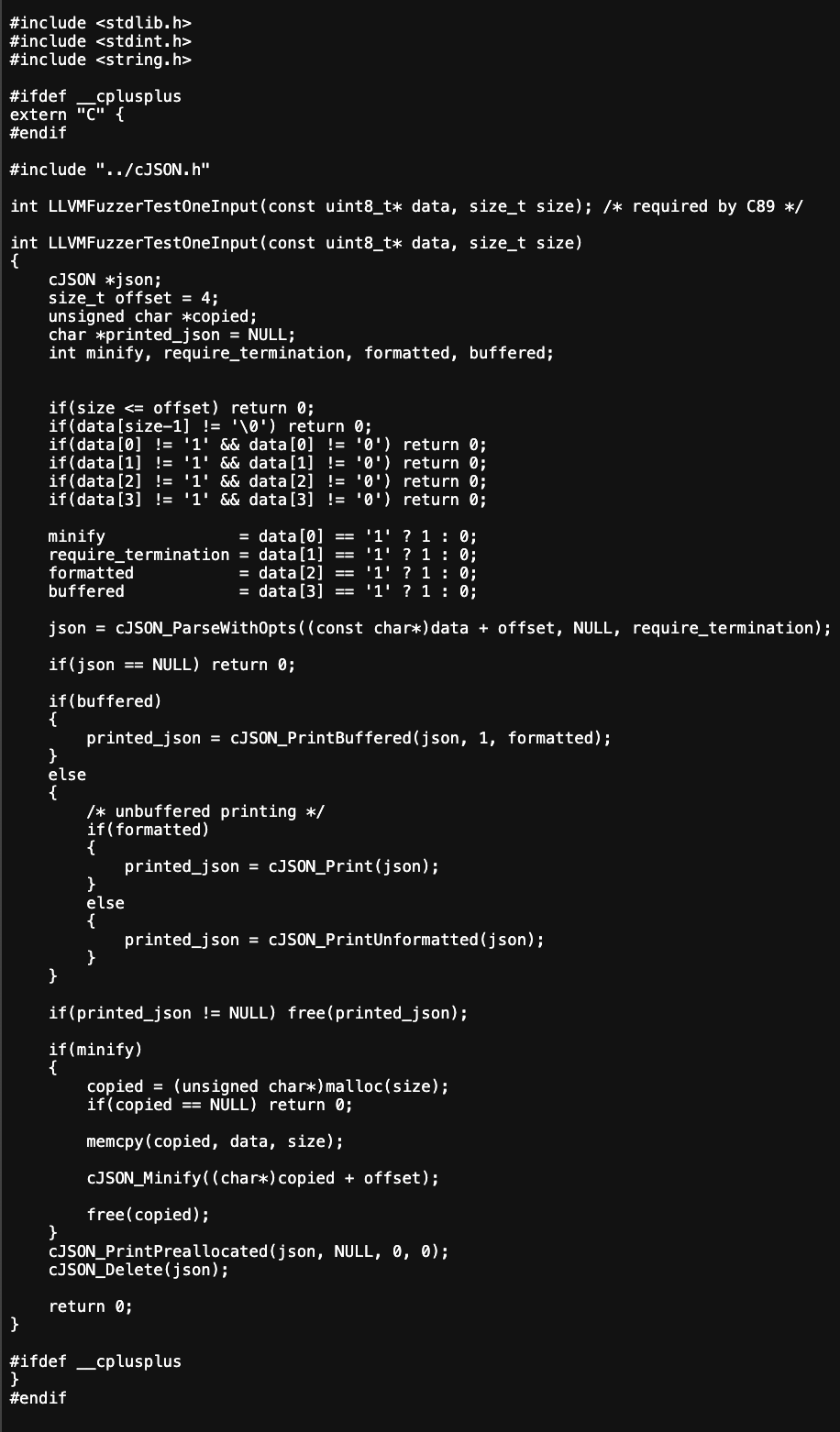 cJSON 객체가 사용한 메모리를 해제하였다. 그런데 CJSON_PrintPreallocated함수에서 받는 'json' 객체는 반드시 유효해야 한다. 하지만 메모리 해제가 된 'json'객체가 NULL이기 때문에 함수호출은 NULL포인터 역참조 오류를 일으킬 수 있다. 이는 프로그램의 비정상적인 종료가 될 수 있음을 의미한다. 그래서 라인 커버리기자 낮은 것인가?