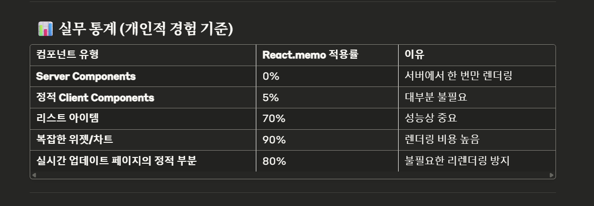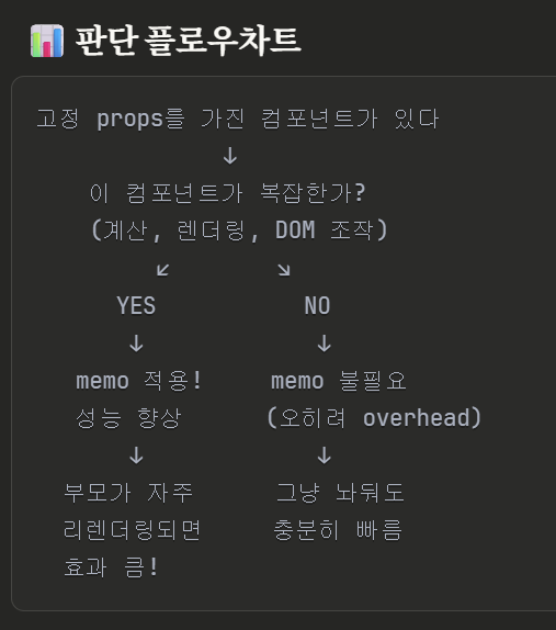 결론: 고정 값이어도 컴포넌트가 복잡하고 부모가 자주 리렌더링된다면 memo를 쓰는 것이 좋습니다! 🎯