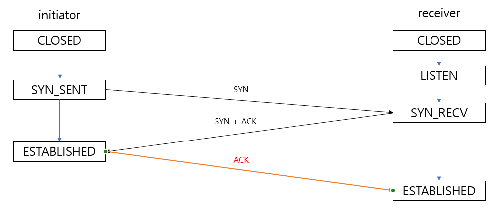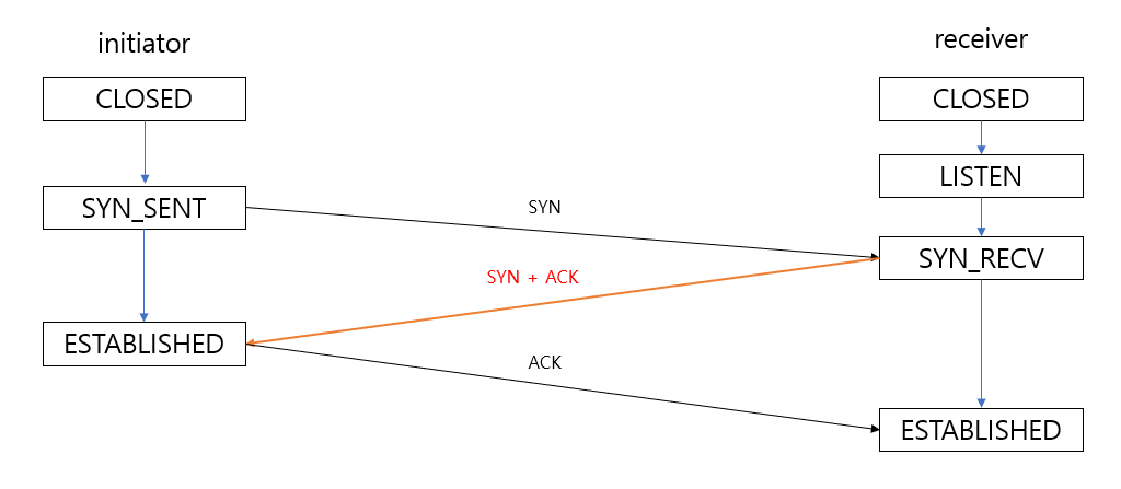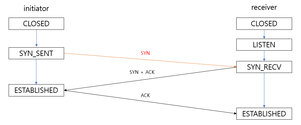 initiator의 상태는 SYN_SENT가 되고, SYN패킷을 제대로 받았다면 receiver의 상태는 SYN_RECV가 된다.