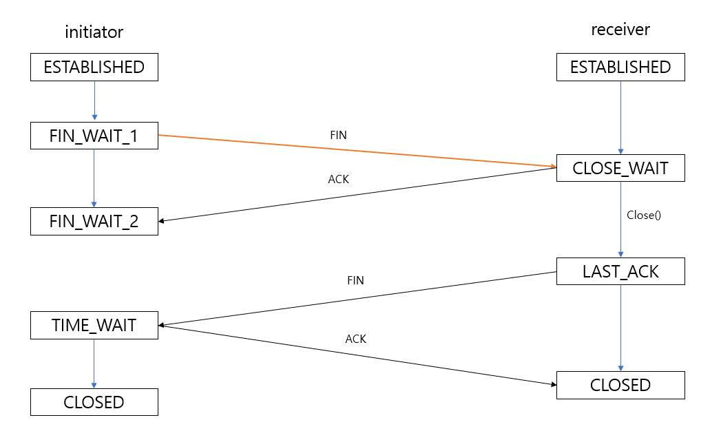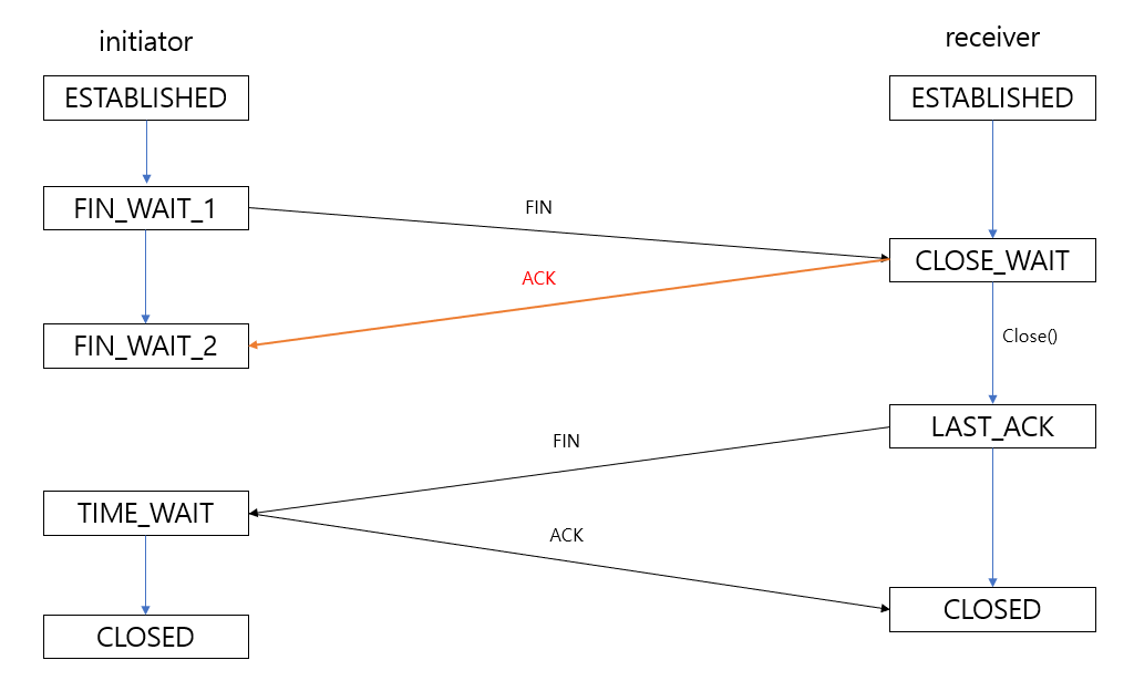 1. 요청자가 수신자에게 FIN패킷을 보내면서 FIN_WAIT_1 상태로 전환한다.