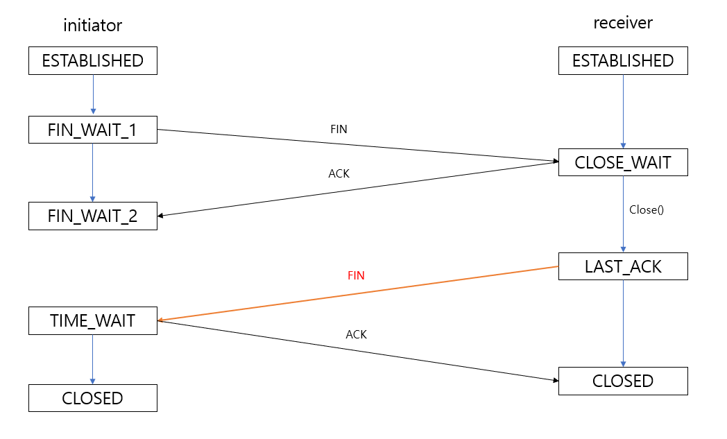 3. 더이상 처리할 데이터가 없는 수신자는 요청자에게 FIN패킷을 전송하고 LAST_ACK상태로 전환하고 요청자가 승인 번호를 보내줄 때까지 기다린다.