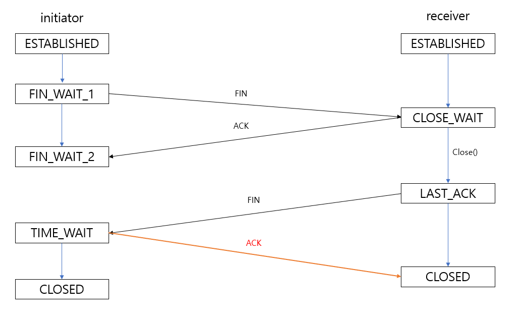 ACK패킷을 받은 수신자는 CLOSED상태로 전환하며 연결을 완전히 종료한다.