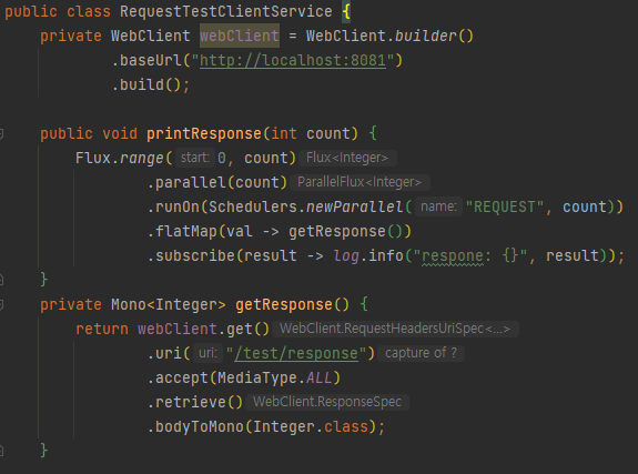 Web Client를 이용하여 병렬요청을 실행하는 코드를 생성하였습니다.