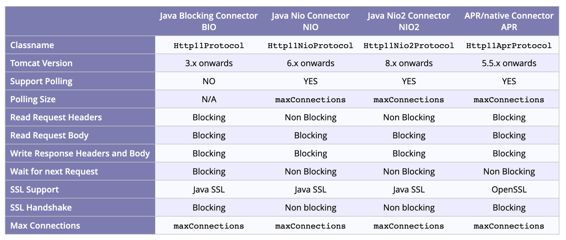 아래 그림은 톰캣의 버전별 Connector 스펙입니다.