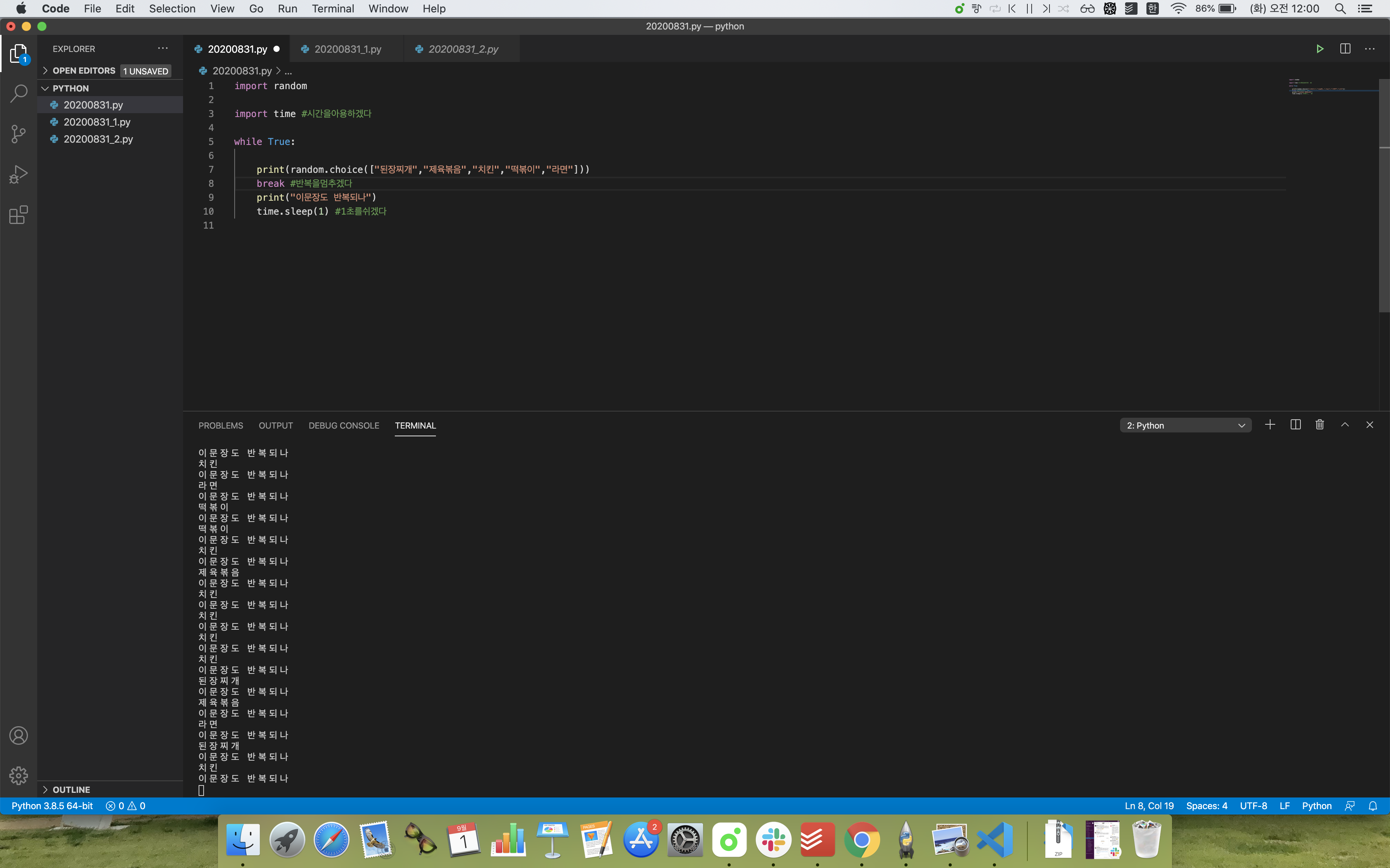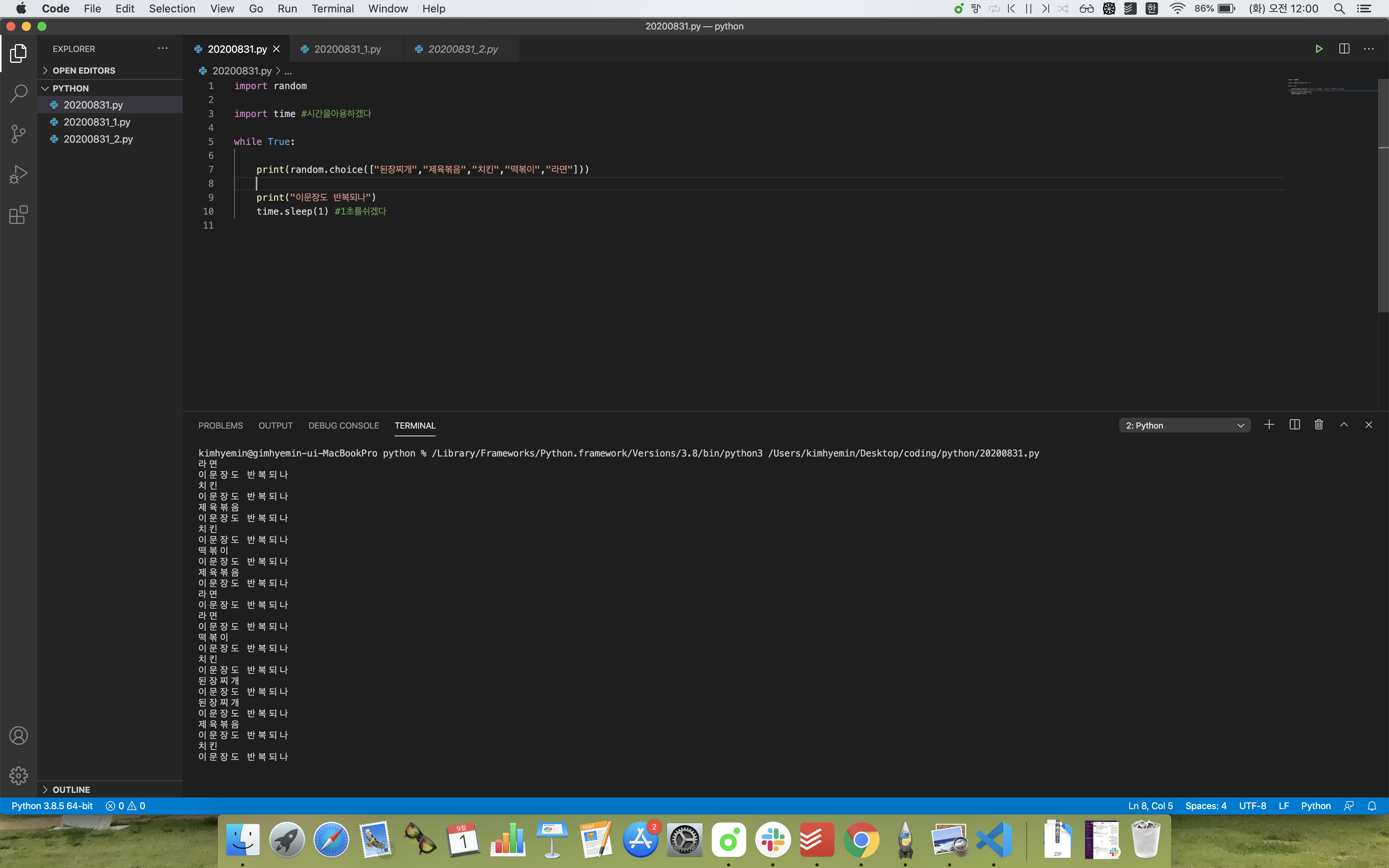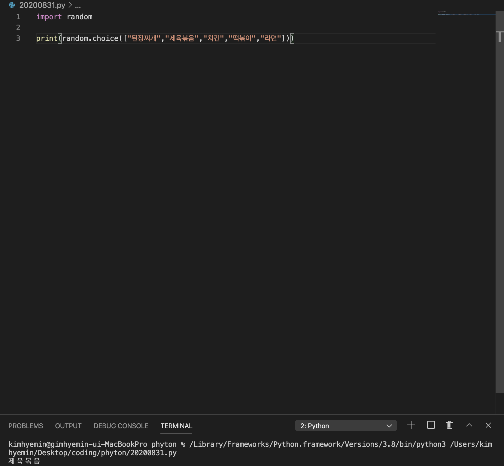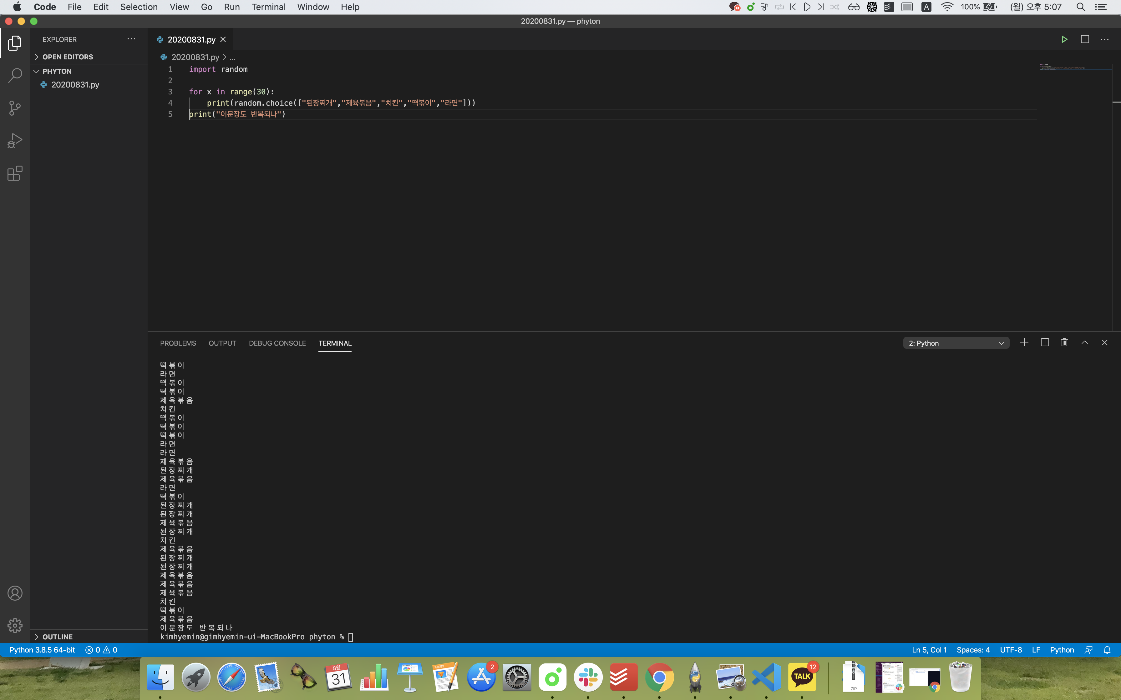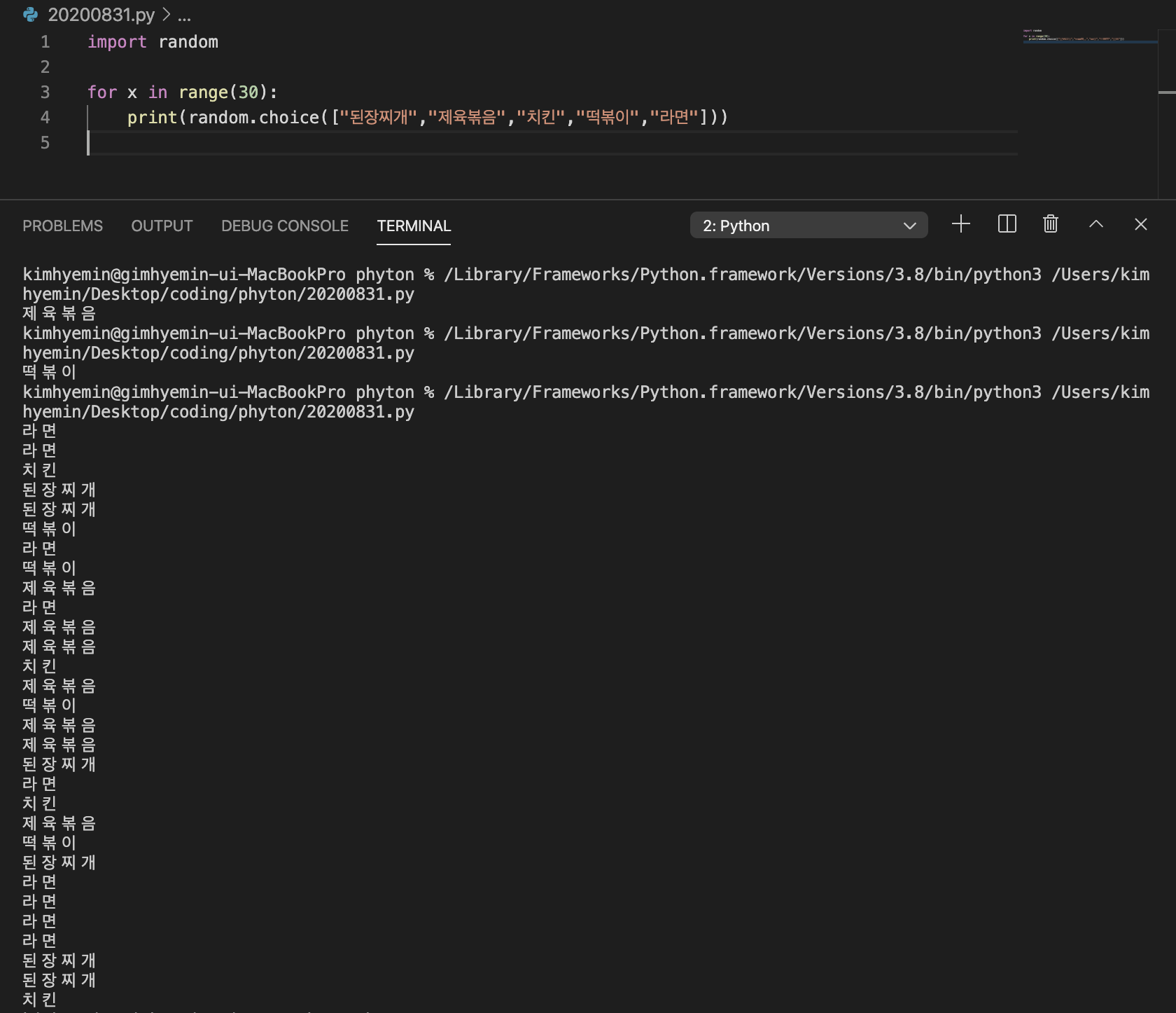 print(random.choice(["된장찌개","제육볶음","치킨","떡볶이","라면"]) print(random.choice(["된장찌개","제육볶음","치킨","떡볶이","라면"]) .