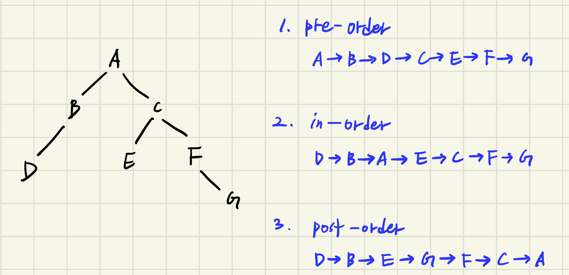 이진 트리를 입력받아 전위 순회(preorder traversal), 중위 순회(inorder traversal), 후위 순회(postorder traversal)한 결과를 출력하는 프로그램을 작성하시오.