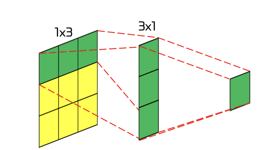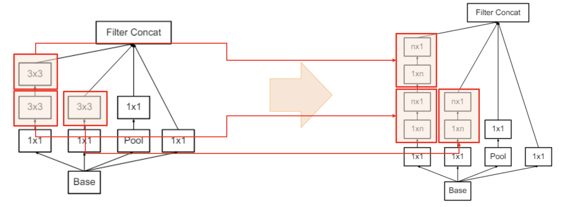 - parameter 갯수를 줄이기 위해 3x3 conv 를 1x3 + 3x1 로 쪼개는 방법도 제시된