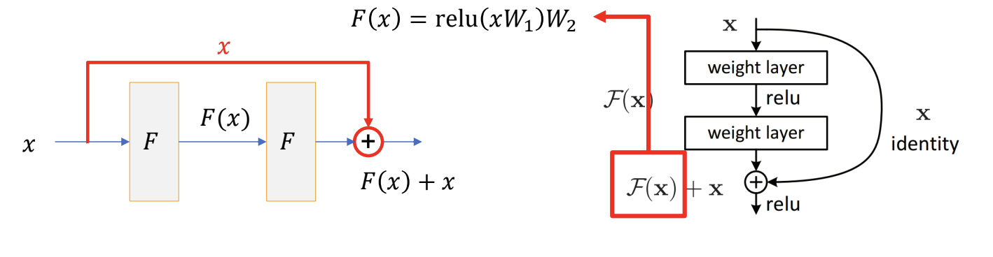 - skip connection 은 F(x) 가 아닌 x+F(x) 가 나오게 하는 것
