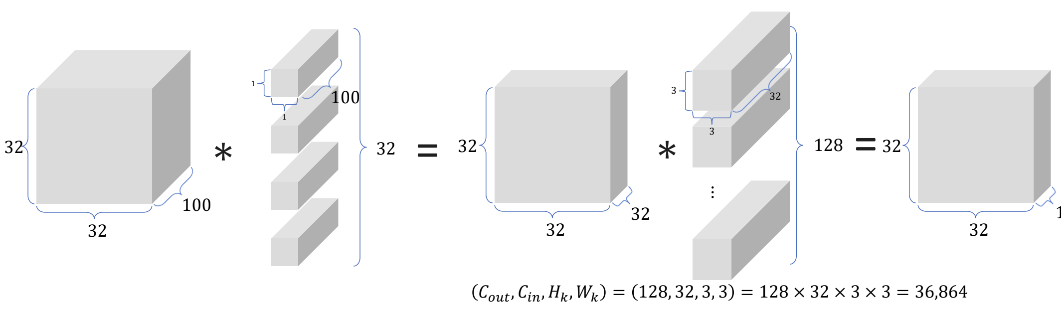 - 의도한 feature map 을 얻으면서 params 의 수가 확연하게 줄어든 것을 관찰할 수 있다.