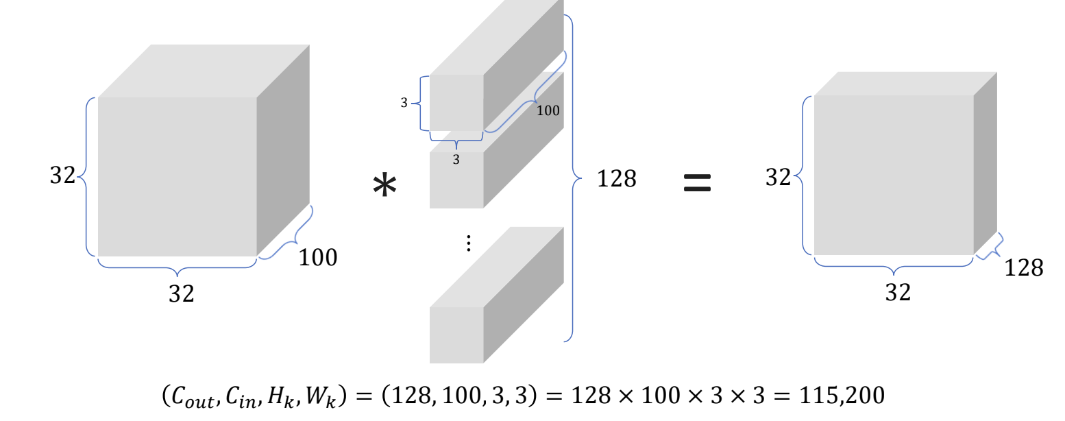- 3x3 convolution 사용 시 115,200 개의 params 필요