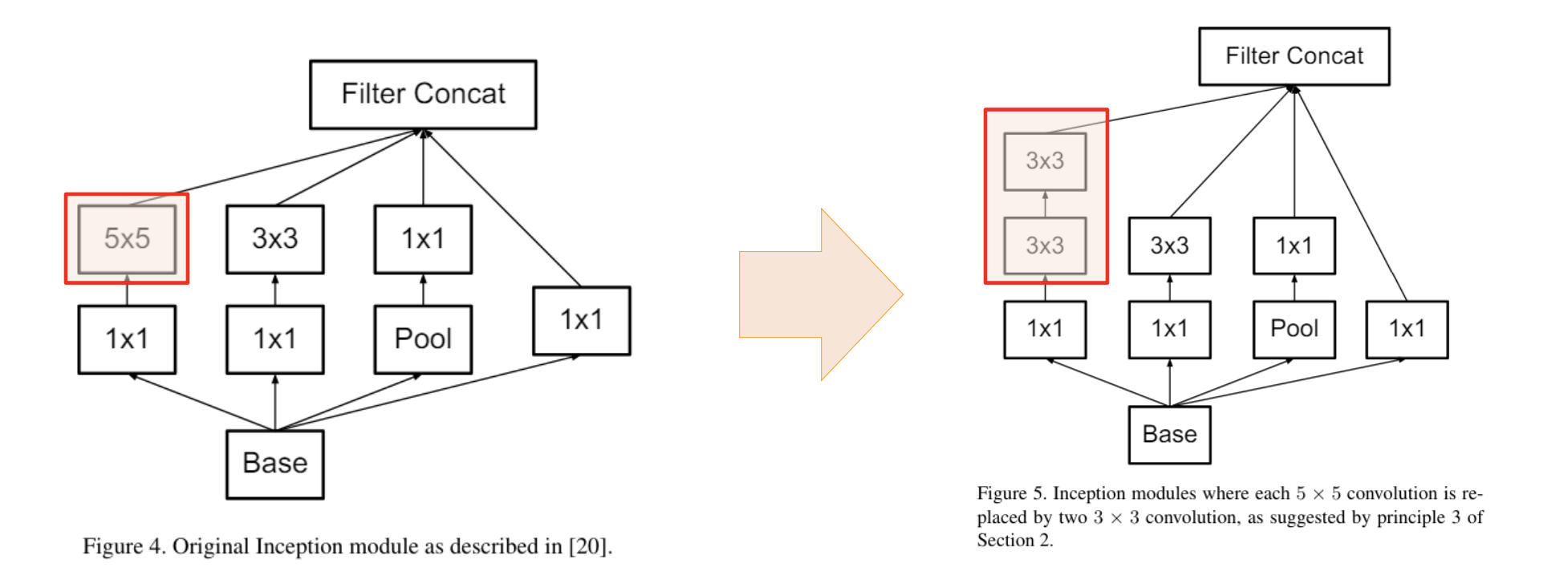 - inception v1 의 5x5 conv 를 두 개의 3x3 으로 교체