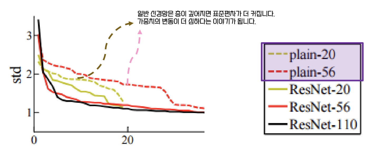 - ResNet 은 층이 깊어질수록 값을 조금씩 바꾸어, 표준편차가 작다
