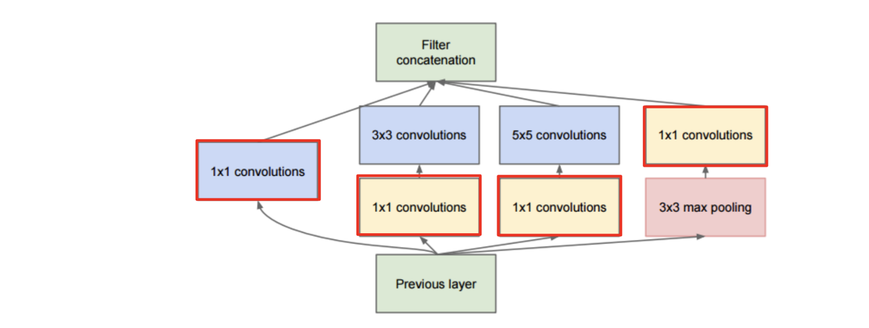 - inception 은 다른 convolution 전 1x1 convolution 을 통해 채널의 수를 줄여준다