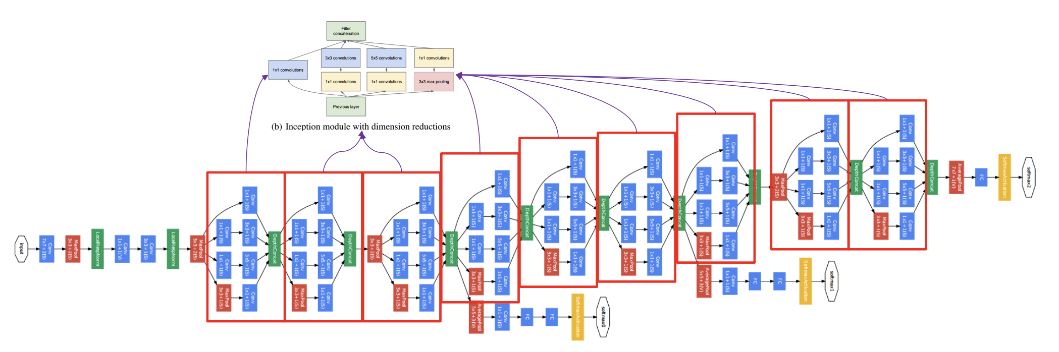 - 1x1, 3x3, 5x5 필터를 활용한 모듈 구조가 계속해서 반복된다