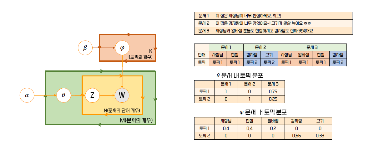 - 베이즈 추론을 통해 잠재된 문서 내 토픽 분포와 토픽 별 단어 분포를