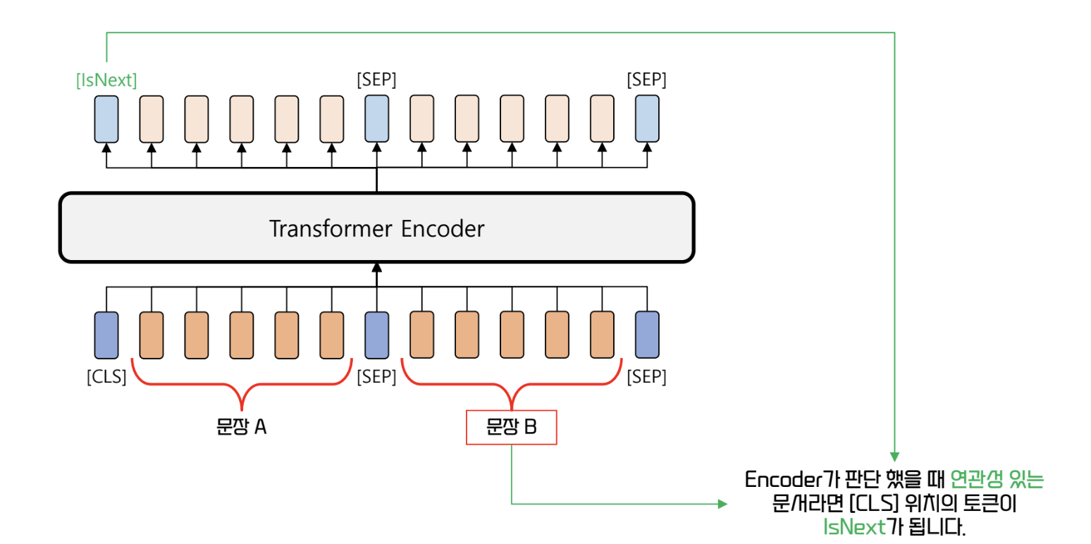 - 연결된 문장은 <IsNext>, 그렇지 않은 문장은 <NotNext> 로 훈련시킨다
