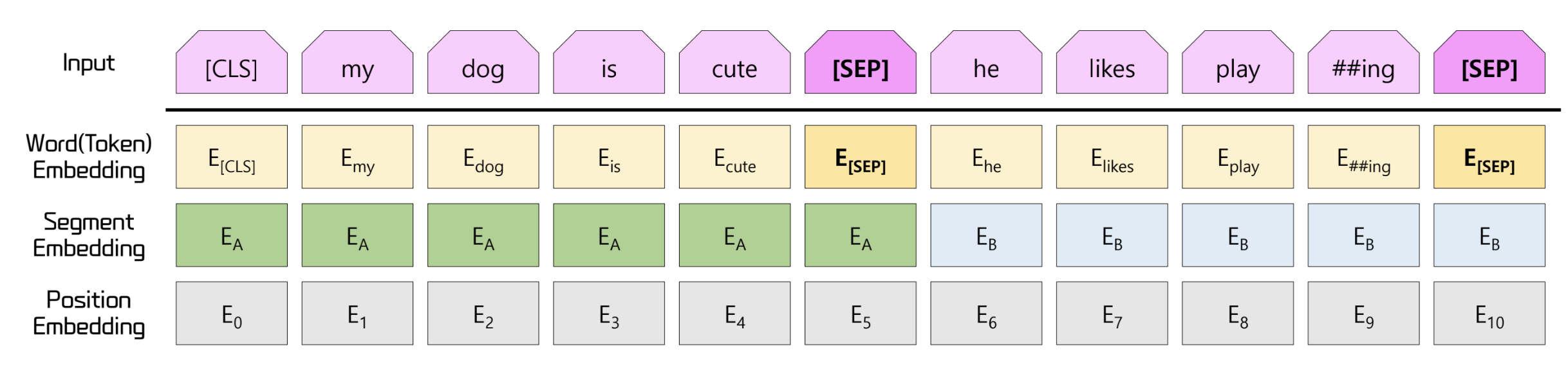 - BERT 에서는 이에 추가로 단어의 소속 문장을 나타내는 segment embedding 도 함께 수행