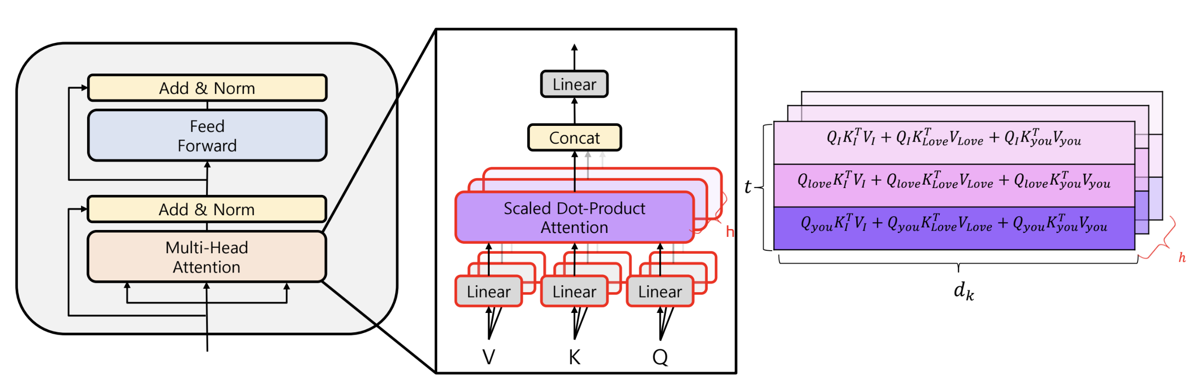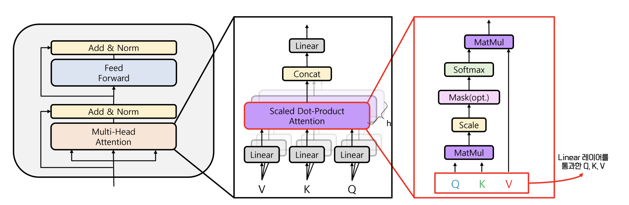 이에 linear transformation 을 거친 결과도 Q, K, V 라고 칭한다
