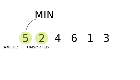 선택 정렬은 정렬되지 않은 영역에서 가장 작은 값을 찾아, 맨 앞에 있는 원소와 교환하는 방식으로 정렬을 진행한다.