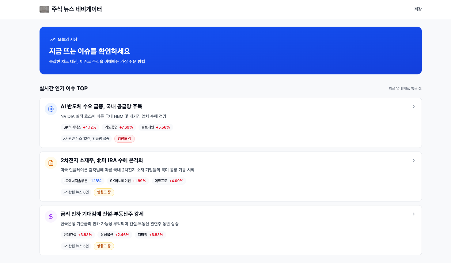 한 줄로 설명하자면 이슈를 통해 주식 흐름을 이해하는 주식 뉴스 네비게이터 서비스다.