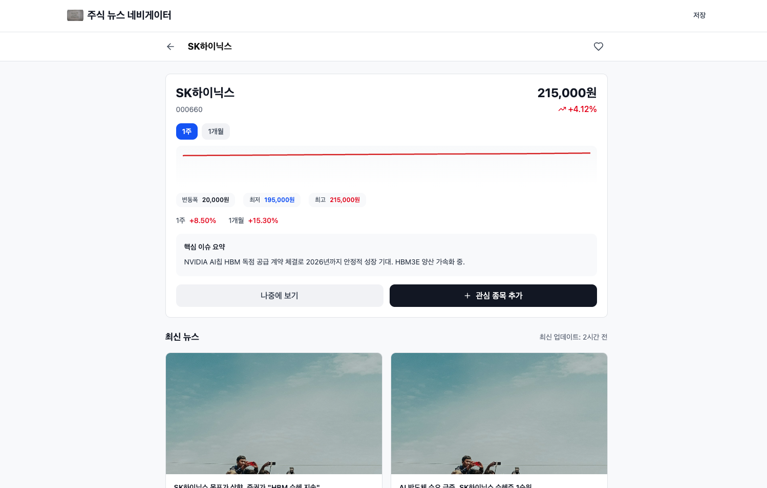 주식 상세 페이지이다. 현재가, 1주/1개월 단위 가격 변동폭, 최저/최고 가격 등과 관련 뉴스를 표시하는 화면이다.