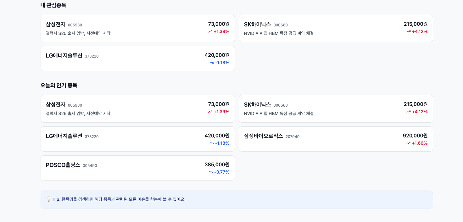인트로 섹션, 실시간 인기 이슈, 내 관심 종목, 오늘의 인기 종목으로 구성된 메인 페이지이다.