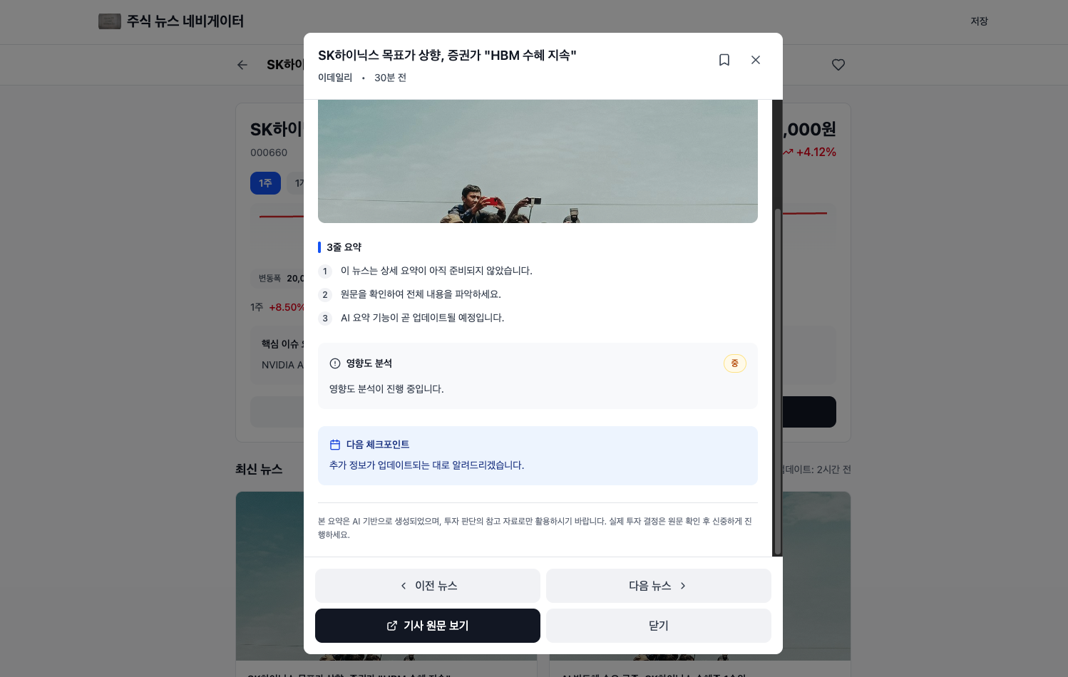 뉴스를 클릭하면 나오는 상세 모달 화면이다. 하단 버튼을 어떻게 구성할지, 어떤 기능을 넣을지는 아직 고민 중이다.