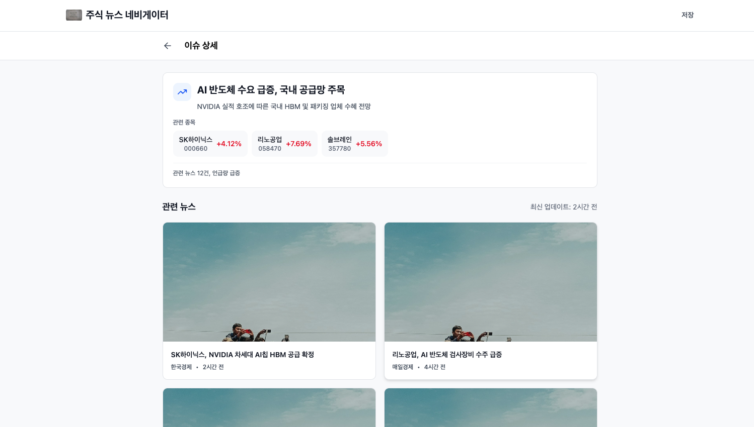 이슈를 눌러서 이동하는 상세 페이지이다. 이슈 요약과 관련 종목, 관련 뉴스를 표시하는 화면이다.
