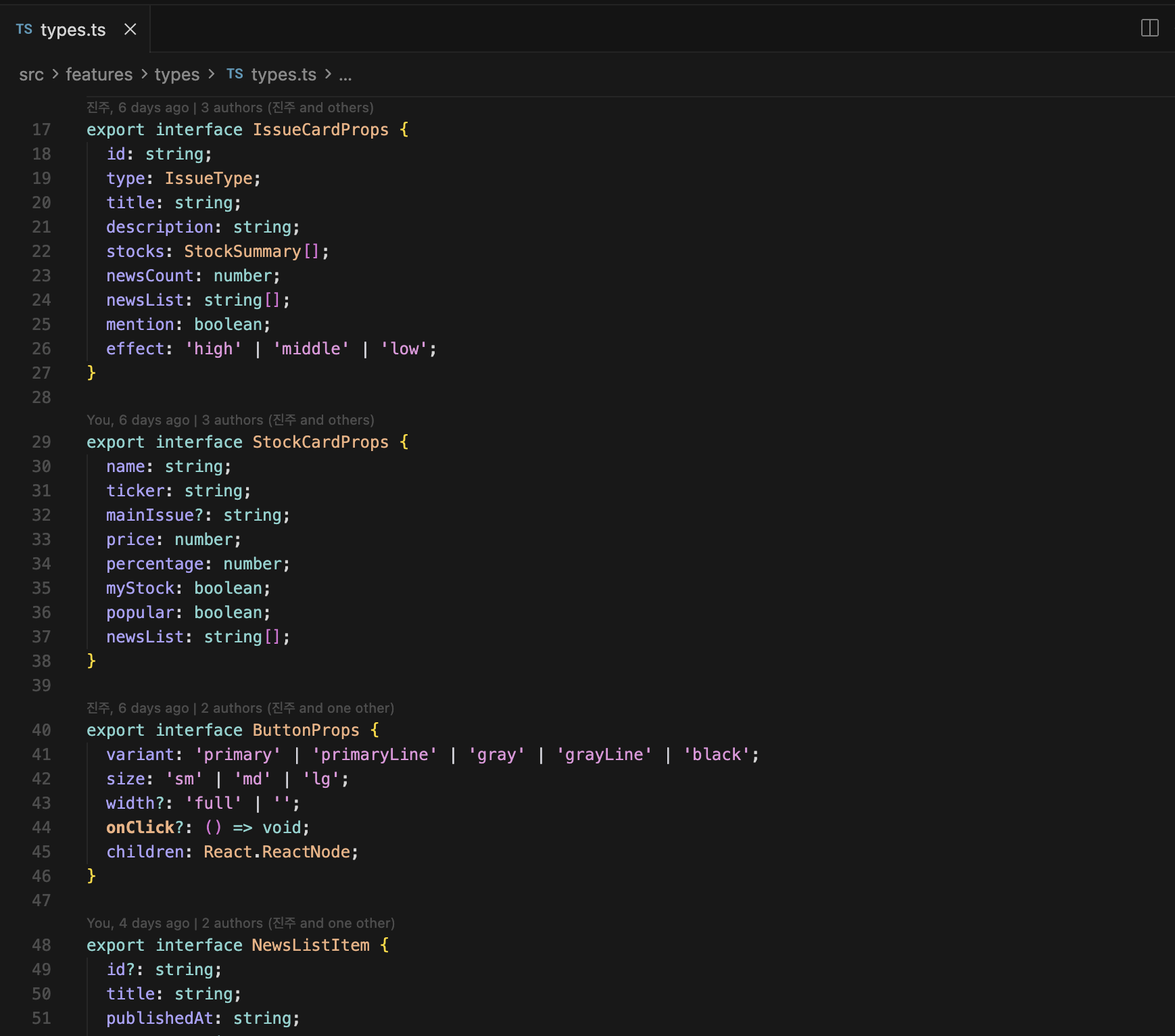 처음에는 전역 types/Types.tsx 파일 하나를 만들어 전체 타입을 넣어두었다. 초반에는 양이 많지 않아서, 이슈용 interface 하나, 주식용 interface 하나 정도를 한 파일에 모아도 크게 불편하지 않았다.