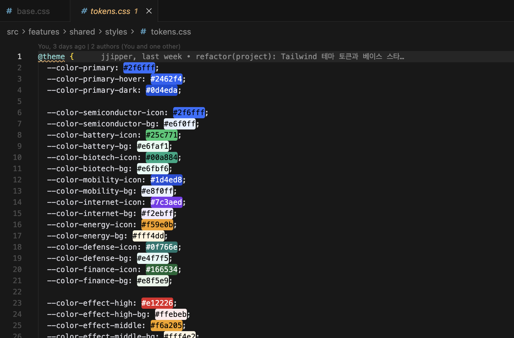 그리고 files.associations는 .css 파일을 Tailwind CSS 모드로 열어줘서, @theme, @source 같은 Tailwind CSS 전용 문법을 다룰 때도 도움이 되었다.