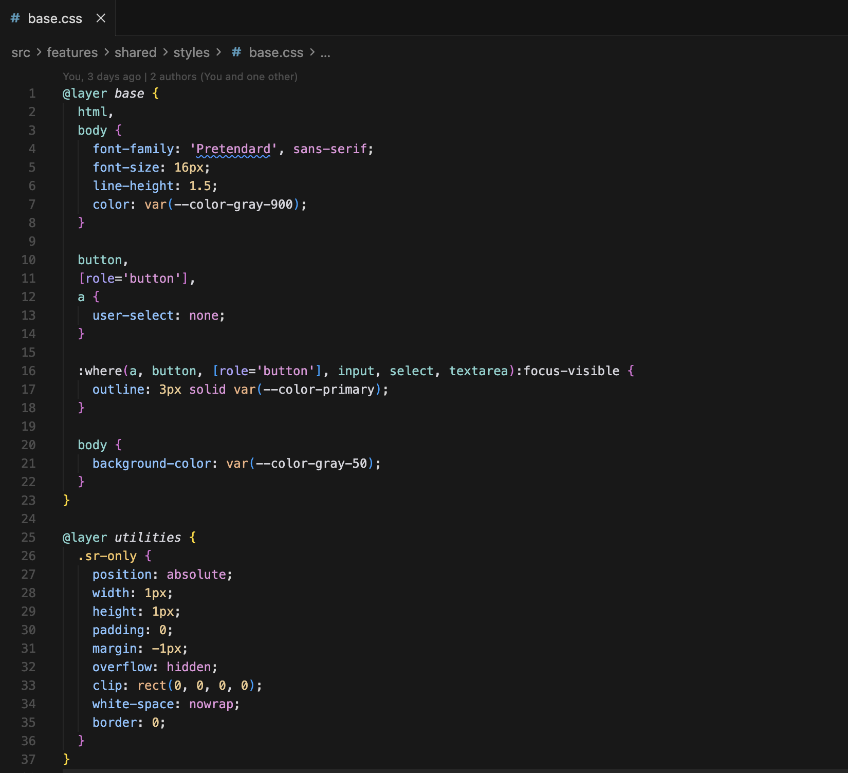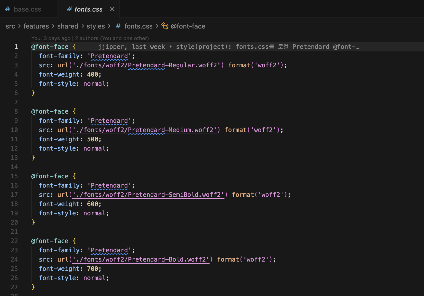위 이미지처럼 현재 프로젝트 구조를 보면 shared/styles 하위에 tokens.css, fonts.css, base.css를 두고 관리하고 있다.