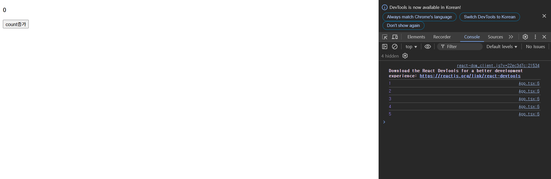 하지만 개발자모드를 통해 콘솔을 확인하면 count의 값은 1씩 증가되어 출력되고있다.