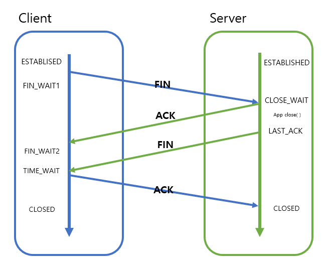 서버에서 close( )명령이 끝나면, FIN 패킷을 전송하고 LAST_ACK상태로 대기- 클라이언트는 FIN 패킷을 받으면 ACK로 응답하고