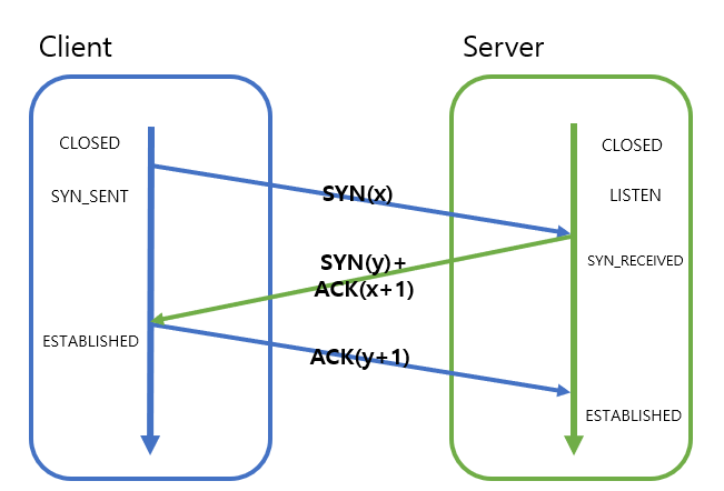 SYN 패킷을 서버로 전송한다. 이후 SYN_SENT 상태로 대기한다.- SYN 패킷을 받은 서버는 받은 sequence number에 1을 더하여 ACK 패킷으로 만들고,