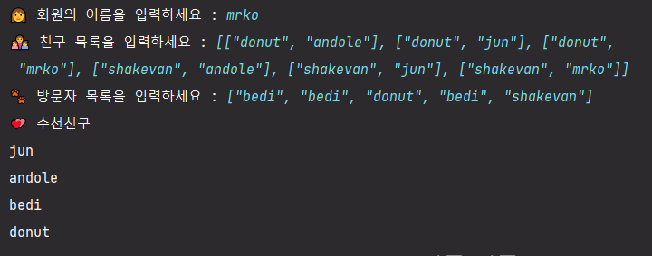 레벨 2의 팀 프로젝트 미션으로 SNS(Social Networking Service)를 만들고자 하는 팀이 있다. 팀에 속한 크루 중 평소 알고리즘에 관심이 많은 미스터코는 친구 추천 알고리즘을 구현하고자 아래와