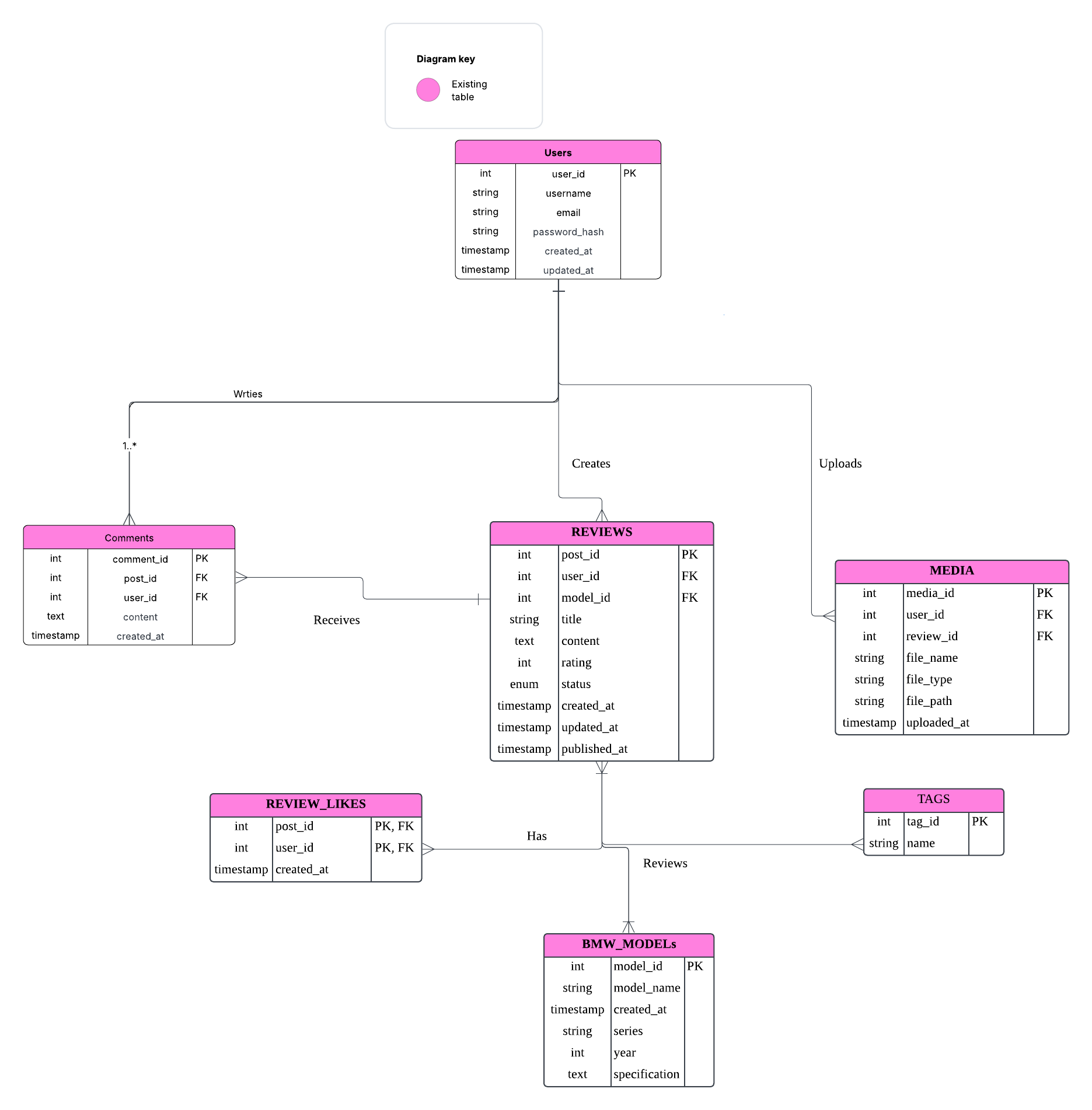 Our one-to-one relationships between REVIEWS and BMW_MODELS is particularly efficient. When a user views a review, we need to fetch both the review content and the car details. Because each review is linked to exactly one model through model_id, the DB can quickly locate the matching records without scanning multiple possible matches.