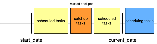 제가 backfill 외에 catchup을 사용하려고 했던 dag는 위와 같이 catchup tasks가 scheduled tasks 사이에 존재하는 경우였습니다.