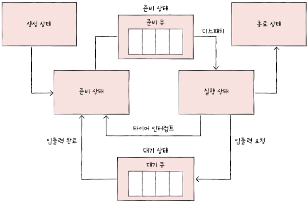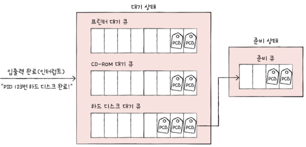 - Waiting queue: processes waiting for I/O operations to complete(blocked state)