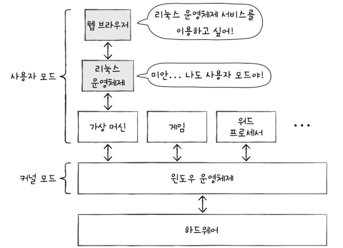 - User Mode: Applications run in this mode. They can't access directly hardware or priviledged instructions