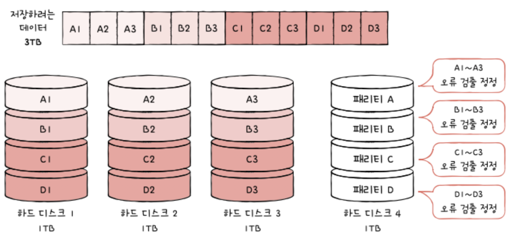 Data is striped across disks, and a separate disk stores parity bits