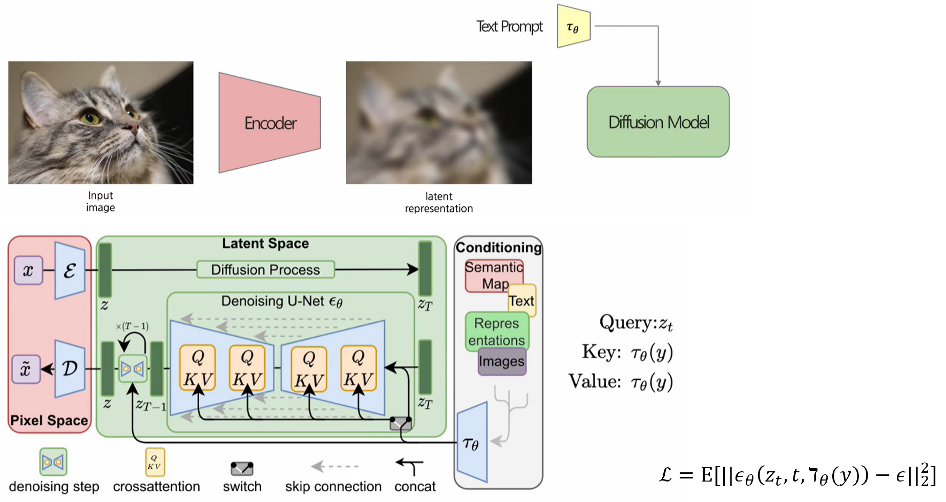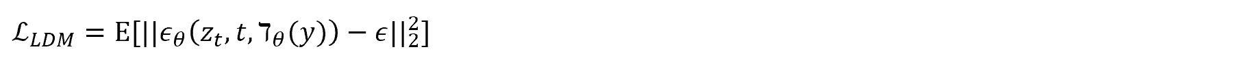 Latent Diffusion model은 perceptual compression을 진행한 뒤에 forward process를 진행한다는 차이점이 있다. 일반적인 모델은 pixel space model, compression을 진행한 모델은 latent space model이라고 부른다. Perceptual compression을 진행하는 이유는 high frequency 한 이미지 정보가 우리 눈에게는 필요할 수 있지만 컴퓨터가 학습하는데에는 배제할 수 있으므로 compression을 한 다음 Diffusion process를 진행한다. 과정은 Autoencoder를 통해 이미지를 벡터로 encoding한 후, U-Net에 text encoder block, cross-Attention 을 추가하여 text같은 condition을 주입하게 된다. Training 과정에서는 학습된 Autoencoder를 사용해서 이미지를 latent vector로 만들게 되고, U-Net을 통해 이 latent vector에 얼마나 noise가 추가되었는지 모델이 예측을 하게 되는데, 여기에 추가적으로 text가 cross-Attention 층에 들어가게 된다. Loss function은 기존의 DDPM과 동일하지만, 가 추가적으로 들어간걸 볼 수 있다.