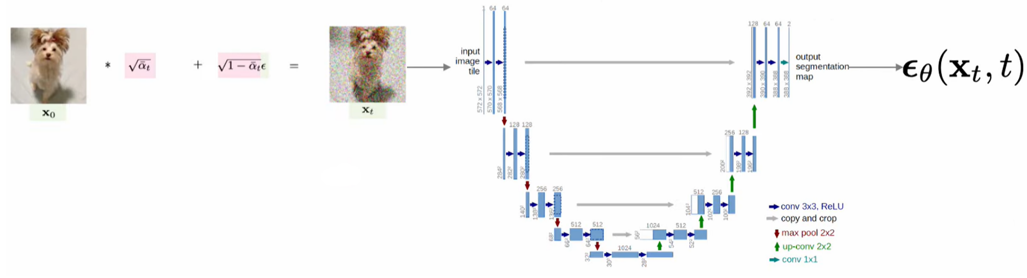 모델 architecture로 U-Net을 사용하고, 를 입력으로 를 만드는데 추가된 noise를 예측한다.