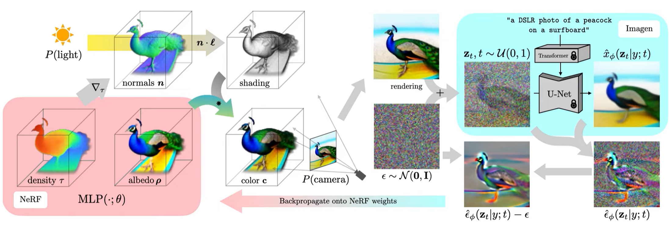 파라미터를 업데이트하기 위해 DreamFusion은 렌더링된 이미지에 noise를 더한 후, encoding된 text와 reconstruction된 이미지를 이용해서 주입된 noise를 예측하게 된다.